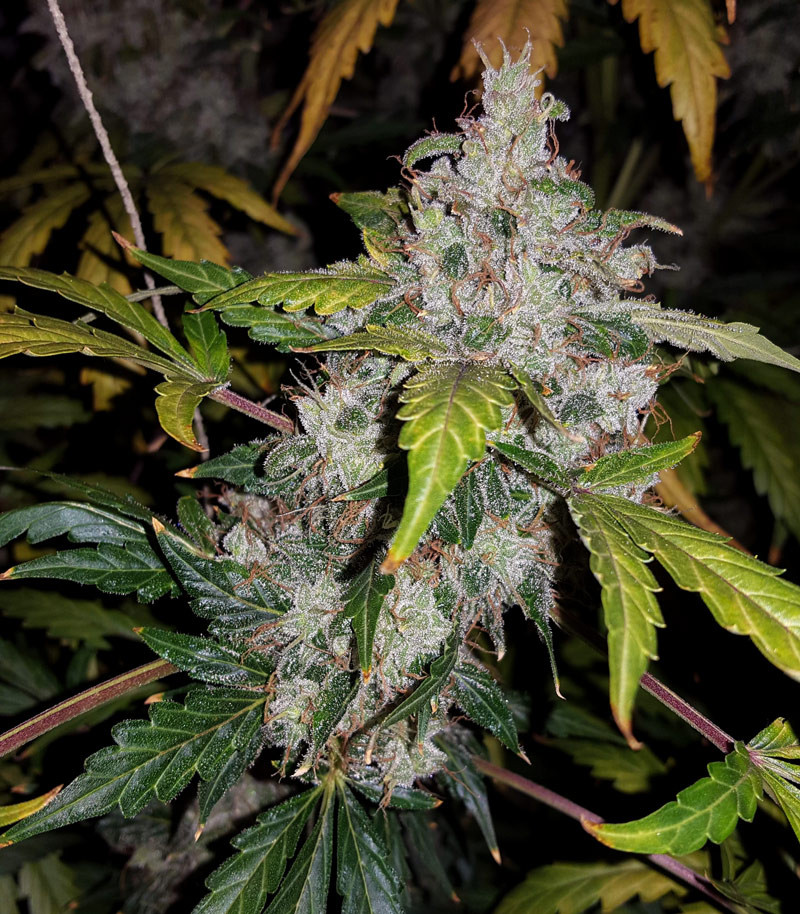 Действительно достойный сорт для новичков! Пахнет обычной зеленью и очень слабо. Невероятно живучая - первые две недели стояла пол тусклым светом 20вт, не росла, стала погибать - заворачиваться вниз и единственная пара листиков на травинке тоже стала сворачиваться в трубочки. Поставил норм свет 130вт с диммером на 40% - за 18 часов ожила и в течение трёх дней расправилась и пошла в рост. Кормил 3/4 от дозы производителей, кушала хорошо, в горшке 20л эир-пот полив на каждый третий-четвертый день по 1,5л. В начале веги светом придавил, несколько дней в росте было 10-12см а вширь уже 20см ботвы. Поднял лампу, за весь цикл вышла в 60см корень-макуха, в ширину максимум 60*60, а бокс 80*80*160. Дефолиацию делал по глупости на живых зелёных лопухах с ранних сроков, подгиб применил когда ветви проросли сквозь натянутую сетку. Веток было 14-15, после подгиба макухи вылезло ещё 2-3 пары ветвей (имею в виду те, на которых пошли соцветия). Дефицитов или перекормов не демонстрировала ни разу, только ближе к концу почернели кончики листьев (возможно перекорм азота, но самый минимальный). К харвесту начал готовиться будто на 3-4 дня раньше - рипен с водой, последний полив только вода. Неделя без воды и последние 3 суток в темноте. К тому времени уже лопухи желтели, а трихомы 80% молоко и 20% янтарь. Полный цикл, не считая первых двух недель простоя в темноте, вышел 68 дней. На перчатках/ножницах после обработки под сушку материала осталось мало - аккуратничал. Во время сушки был только выдув через фильтр, движения воздуха сильного в боксе не было, но стигмы отсыхали и осыпались очень-очень сильно. Мокрого (с веточками) вышло 200, плюс 13 попкорн - его сушил в духовке, запах кстати после такой сушки ОЧЕНЬ ТОМАТНЫЙ, подтверждено тремя разными людьми. Итоговый результат 50 сухого газона плюс 3 от попкорна. Запах на пролечке мощнейший, мягкий и я бы сказал еловый. При дегустации даёт мягкий вкус огородной зелени (морковь/картошка) - странные ассоциации, согласен. Эффект контролируется, что крайне для меня удивительно. Не хочешь двигаться - она даст тебе стоуна. Захотел деятельности - она поднимет и поможет начать и втянуться. Удивительная девочка, одним словом. Первый гров, вложился основательно, результат считаю сильным и достойным. Спасибо за хороший посевной материал. Кстати смог взвести только с третьей попытки: первый раз нарушил корешок при высадке в грунт, второй раз слишком мокрая ватка была и самка вздулась, зато третья взошла за менее чем сутки и дала за два дня ультра корень. Корневая разошлась до днища горшка но тонкими волосками. Основная корневая думаю уместится в 10л горшок. Всем рекомендую всеми руками, супер сорт!!