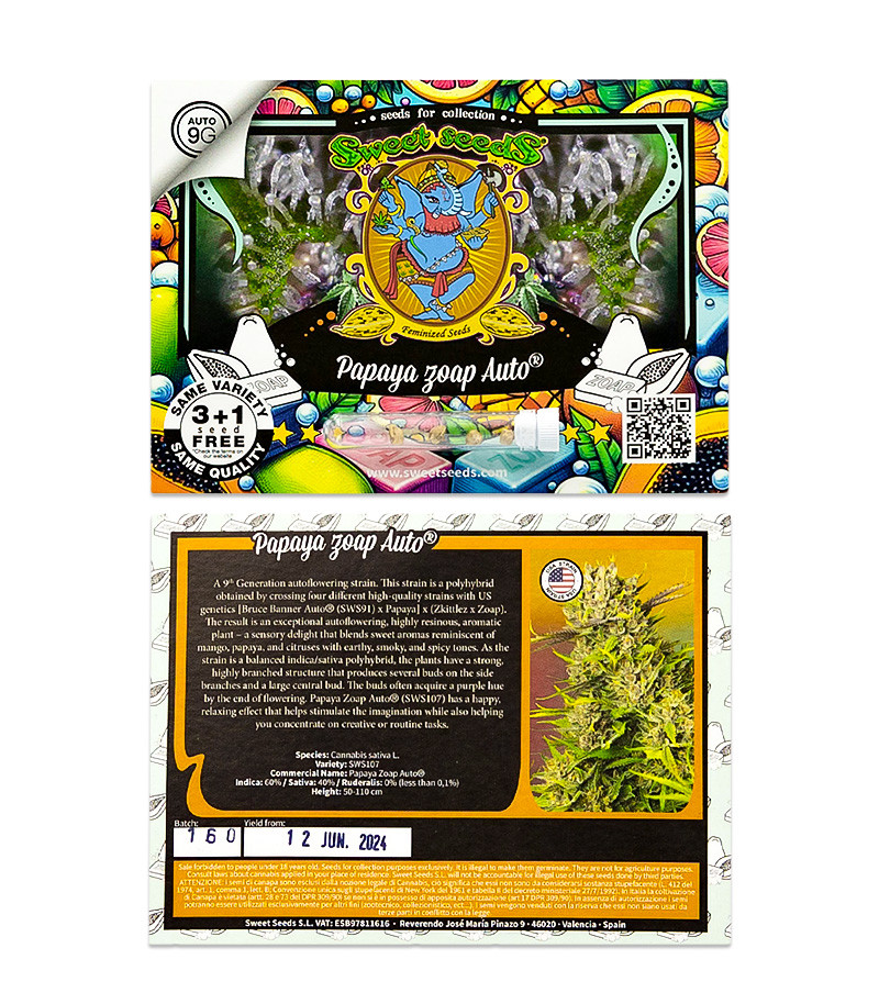 В последние годы европейское видение эволюции каннабиса направлено в сторону активного применения американских корней. Все больше производителей отказывается от локальных генетик в пользу популярных сортов с Западного побережья Калифорнии. И Sweet Seeds не исключение. В родословной одного из их последних гибридов Papaya Zoap Auto собрано сразу четыре сорта из США: Bruce Banner, Papaya, Zkittlez и Zoap. Это первоклассный автоцветущий гибрид, который своим исключительным урожаем способен покорить сердца даже самых требовательных гроверов. Его терпеновый профиль не может полностью описать даже весь словарный запас богатого на эпитеты русского языка.