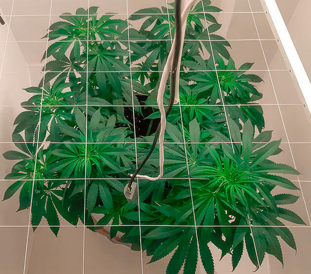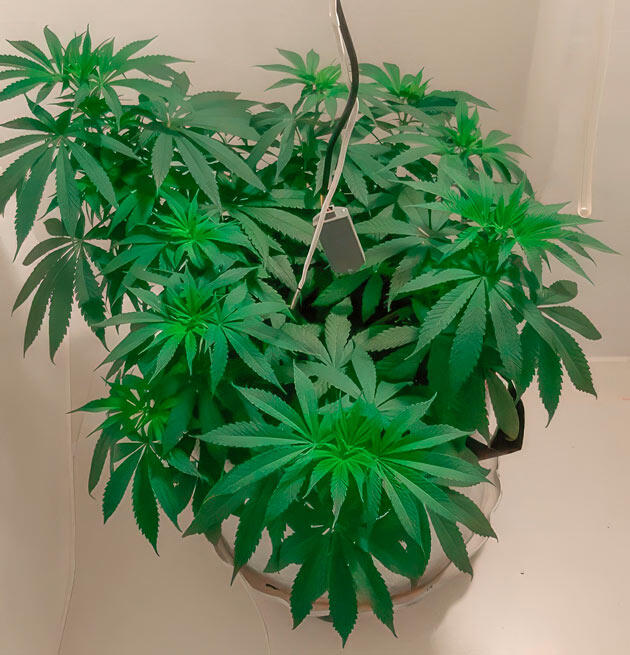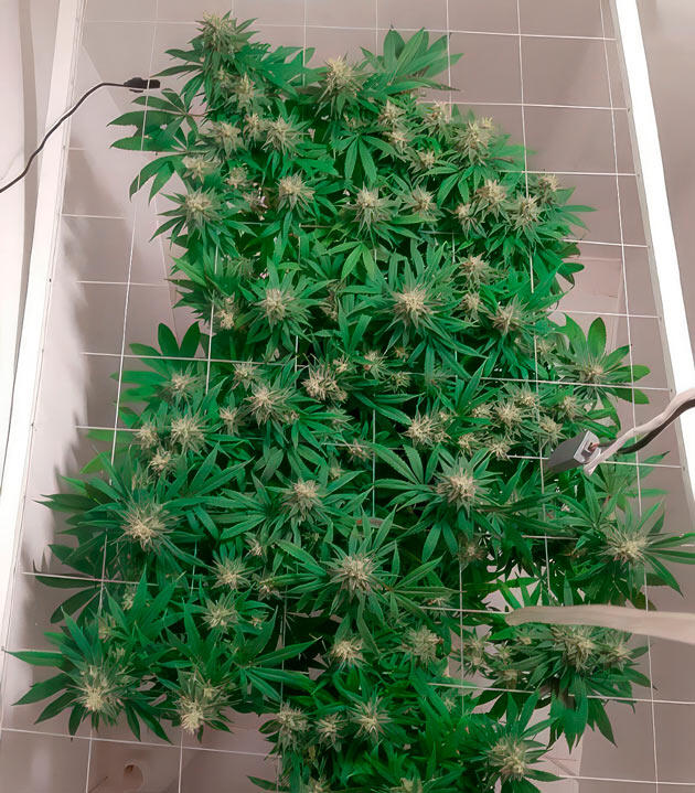В начале девятой недели провел небольшую дефолиацию — удалил четыре лишних листа. На 59-й день передвинул под сеткой центральный побег, но в целом растение все еще выглядело маловатым для перехода на цветение. Обычно на этом сроке я уже ставлю фотикам режим 12/12, но здесь решил дать Гуле немного больше времени. На тот момент выше сетки пробивалась только центральная ветка и еще одна с противоположной стороны. Планировал завершить цикл «удобрения + чистая вода» и только затем переводить на цвет.